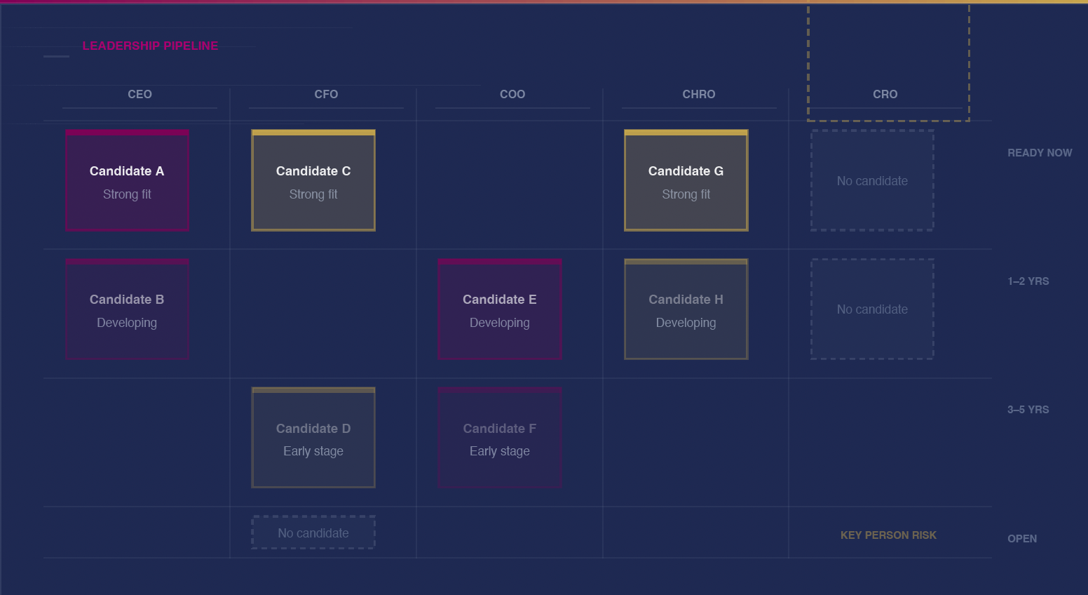 Critical roles occupied by leaders with no identified successors. Positions where an unexpected departure would create immediate organizational disruption.