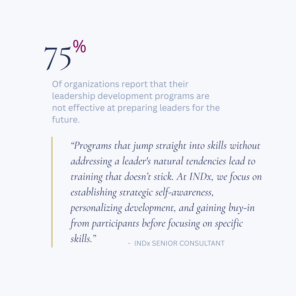 Leadership development works when it starts with the behavioral foundation, then builds the skills that stick. INDx Talent cohort programs start with who each leader is at their core, using validated assessment data to build self-awareness before layering in skills.