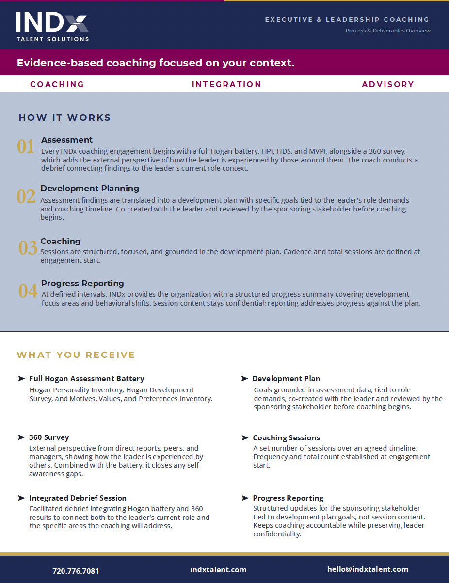 INDx coaching engagements begin with a full Hogan battery, HPI, HDS, and MVPI, alongside a 360 survey. The coach conducts a debrief connecting the results to the leader’s context to identify the specific development areas the engagement will address.