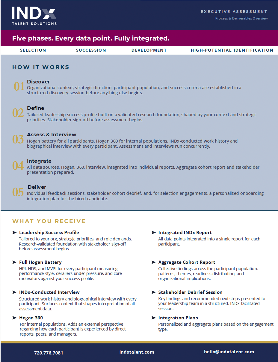Executive Assessment is a fuller engagement: the success profile is tailored to your organizational context, every participant receives an INDx-conducted interview, and all data points are integrated into a synthesized report.