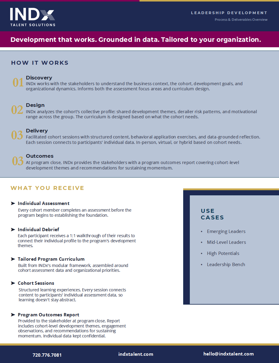 INDx Leadership Development is designed for cohorts of emerging managers, mid-level leaders, and high-potentials, the leaders whose development trajectory has the most direct impact on organizational performance over the next three to five years.